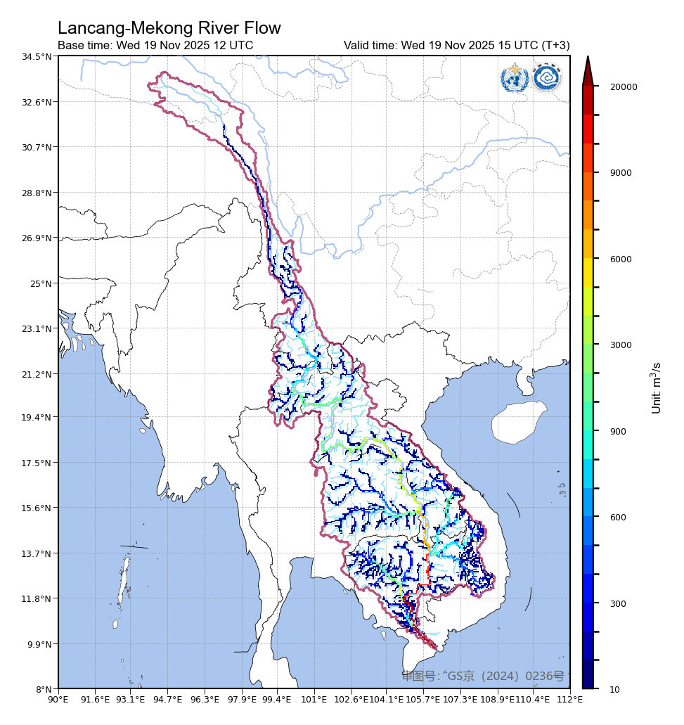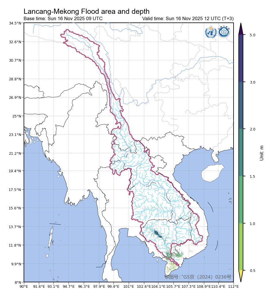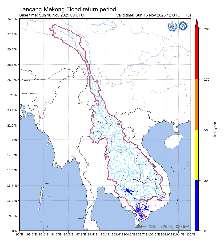 Based on the hydrodynamic model built by the Lancang-Mekong Basin Meteorological Integrated Service Sharing Platform, historical observation data and three-hour refined grid forecast data for the next 10 days are used to obtain a 500-meter resolution flood area and flood depth forecast for the next 10 days. Flood return period and critical rainfall determine the flood risk in the next 10 days.