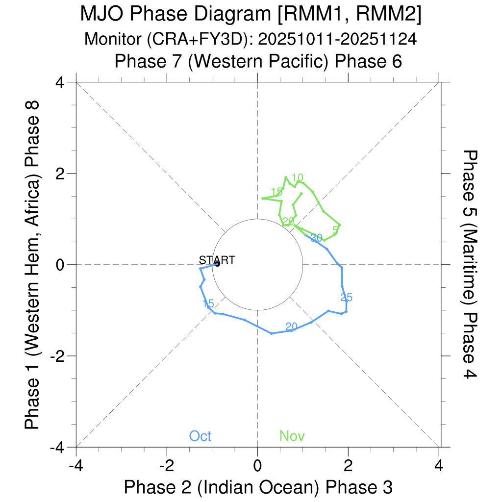 2. Amplitude: The distance from the origin (center) reflects the MJO’s strength. A radius >1 indicates a strong MJO event, while values<1 suggest weak or inactive conditions.